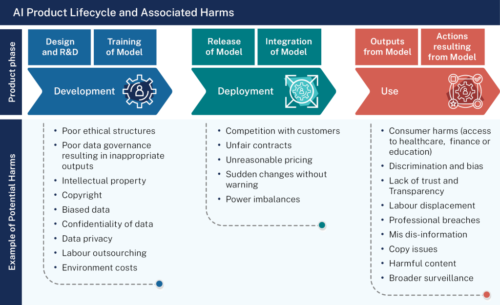 The diagram provides a visual representation of the AI lifecycle and identifies harms that may occur at each stage.